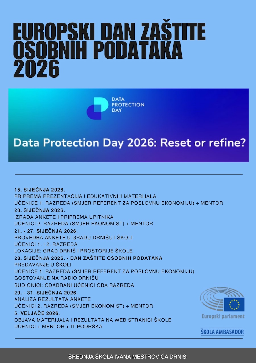Dana 28. siječnja 2026. godine obilježava se Europski dan zaštite osobnih podataka, s ciljem podizanja svijesti o važnosti privatnosti i zaštite osobnih podataka. Naša EPAS škola organizira niz aktivnosti u kojima će učenici aktivno sudjelovati kroz edukaciju, istraživanje i medijsku prezentaciju teme.