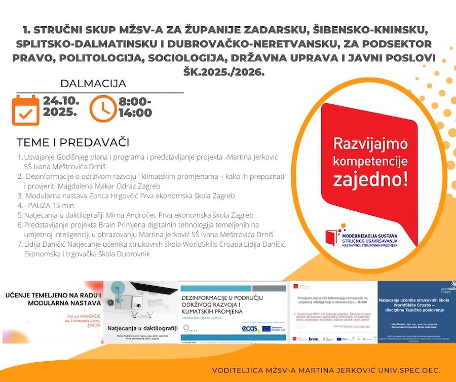 Dana 24. listopada 2025. godine online putem održano je I. Međužupanijsko stručno vijeće županija Zadarske, Šibensko-kninske, Splitsko-dalmatinske i Dubrovačko-neretvanske za podsektor pravo, politologija, sociologija, državna uprava i javni poslovi. Skup je okupio 29 nastavnika, a vodila ga je naša nastavnica Martina Jerković, univ.spec.oec.
