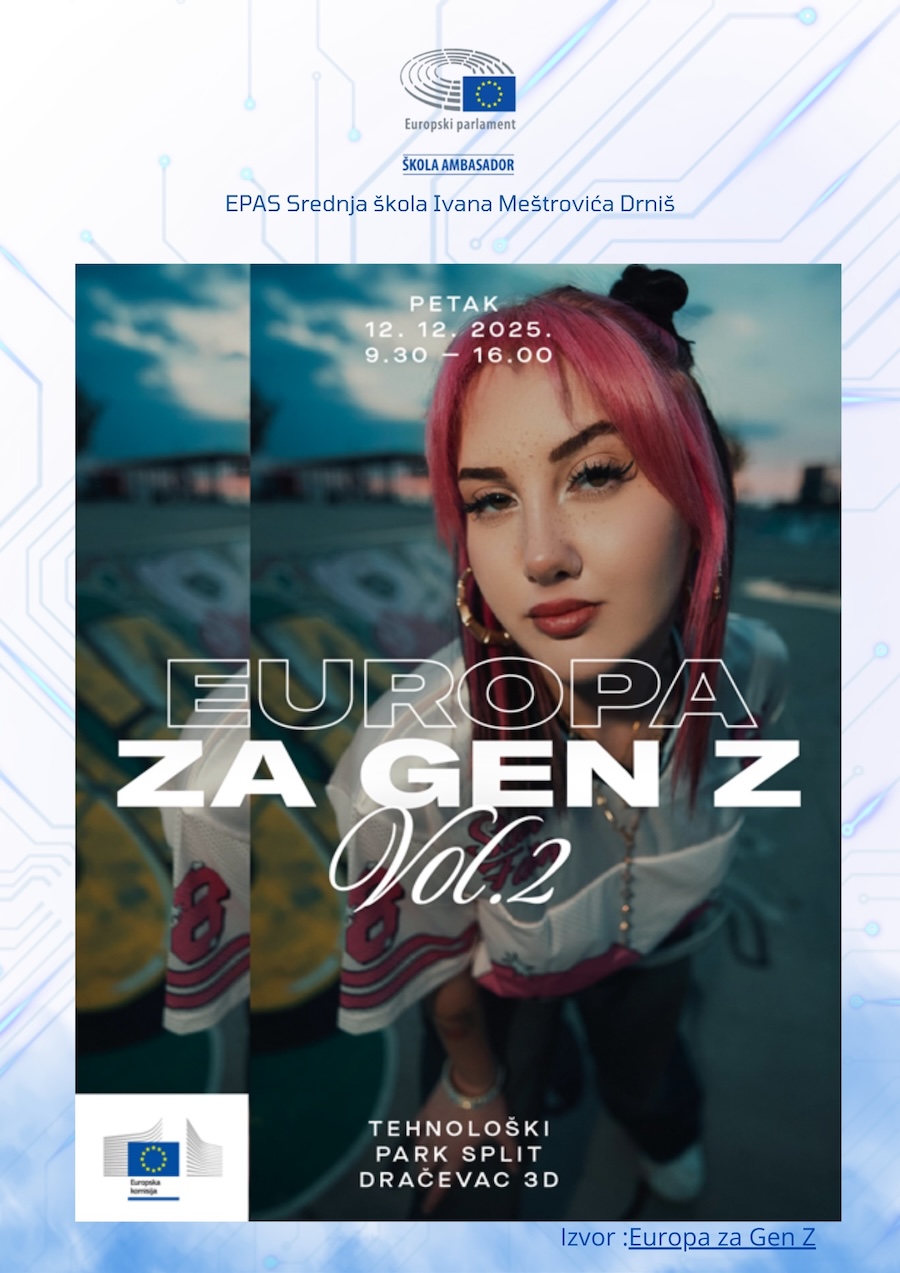 U sklopu izvannastavne aktivnosti EPAS – European Parliament Ambassador School programa, šesnaest učenika naše škole sudjelovat će na drugom izdanju godišnje konferencije Predstavništva Europske komisije u Hrvatskoj pod nazivom "U raljama algoritama? Mladi i digital". Događanje će se održati 12. prosinca u Tehnološkom parku Split, s programom od 9:30 do 16:15 sati.