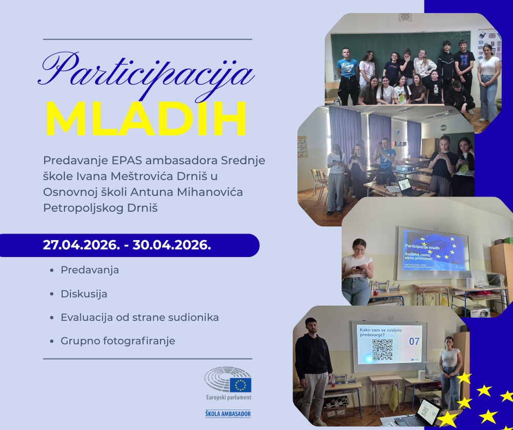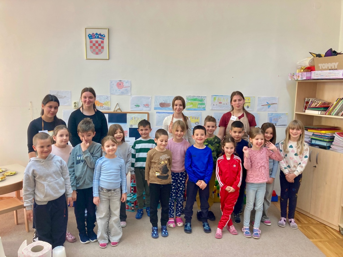 U sklopu projekta Traveša.hr nastavljamo suradnju s Dječjim vrtićem Drniš. Naše učenice EPASice — Marta Jakovljević, Lana Baran, Marija Bakmaz i Marijana Šutić — uz mentoricu senior ambasadoricu Martinu Jerković, posjetile su predškolsku skupinu Pahuljice. Dočekala ih je odgajateljica Katica Jakelić, kojoj se kasnije pridružila i Marica Ramljak.
