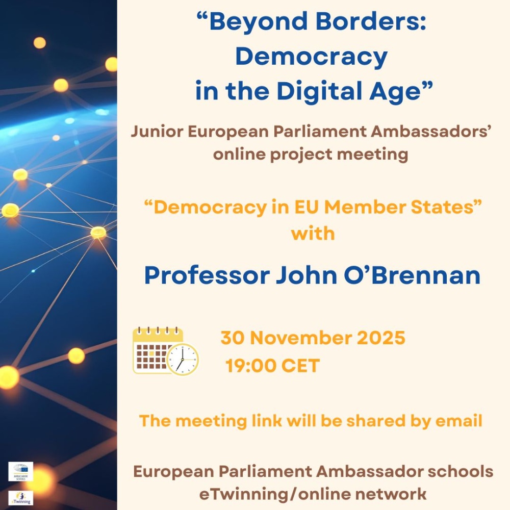 Na platformi Zoom je večeras, od 19 do 21 sat, održan međunarodni online sastanak EPAS ambasadora uključenih u eTwinning projekt „S one strane granica: demokracija u digitalno doba“. Sudionicima se obratio professor John O'Brennan s Maynooth University, koji je održao izuzetno poticajno predavanje o medijskoj pismenosti. Naglasio je važnost kritičkog promišljanja te mladima poručio da uče, čitaju i stvaraju znanje, upozorivši ih da ne prihvaćaju nekritički sadržaje s TikToka i drugih društvenih mreža koje sve više postaju nestabilna i nesigurna komunikacijska područja za mlade.